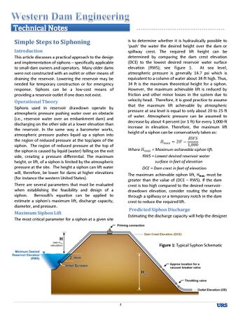 This article discusses a practical approach to the design and implementation of siphons – specifically applicable to small-dam owners and operators. Many older dams were not constructed with an outlet or other means of draining the reservoir. Lowering the reservoir may be needed for temporary construction or for emergency response. Siphons can be a low-cost means of providing a reservoir outlet if one does not exist.
