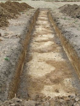 - "Trenches - Trenches are long, narrow excavations. They are advantageous for studying earth materials on steep slopes and in exposed faces. Trenches made by power equipment, such as backhoes, power shovels, and bulldozers, may require hand trimming of the sides and bottom to reach relatively undisturbed material. The method is of particular value in delineating the rock surface beneath the principal spillway and in abutments and in exploring auxiliary spillway materials. Trenching may be the most feasible method of investigation in materials containing cobbles or boulders. Trenches may yield valuable information on potential rock excavation and core trench depth along the centerline of the structure, depending on its design."[1]